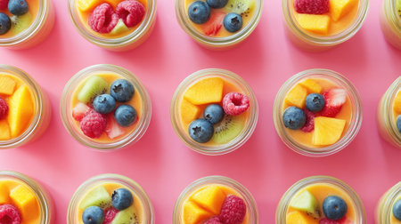 This image showcases an eye-catching arrangement of yogurt parfaits topped with assorted fresh fruits and granola on a vibrant pink backdrop, perfect for desserts.