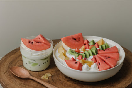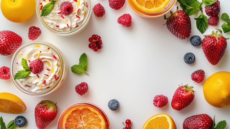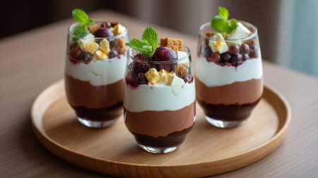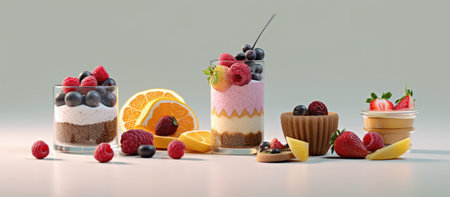 Festive layered trifles with colorful fruits and cream for a delightful dessert experience