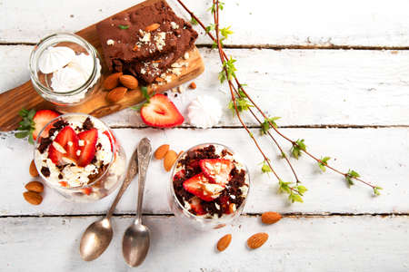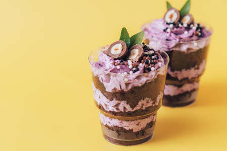 Trifles made with fresh berries and mascarpone cream. Portion desserts. Top view, copy space
