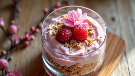 Delicious raspberry yogurt parfait with granola and pink blossom on wooden table. That the image is generated using AI.