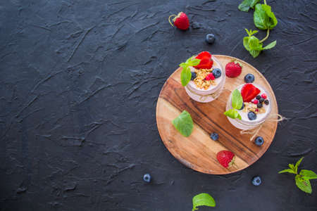 Homemade natural fruit yogurt with granola, strawberries, raspberries and cherries in glass jars on gray background. Healthy breakfast set.