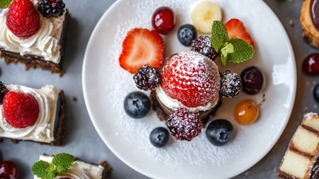 A beautifully arranged plate of desserts with fresh berries and fruits, perfect for a sweet treat.