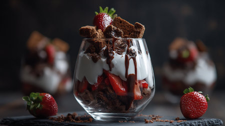 Delicious Strawberry Brownie Parfait in Elegant Glass with Chocolate Drizzle