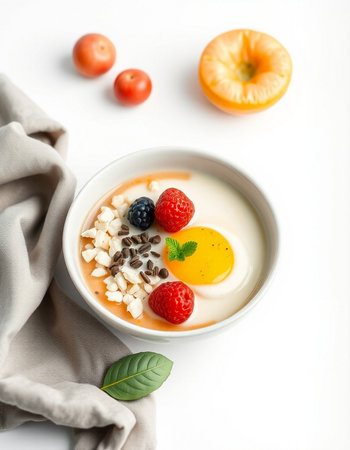 Fresh dairy summer dessert cream closeup on white background copy space. Sweet raw blueberry, peach, fruit breakfast. Chia seeds organic pudding mousse. Vegan fresh coconut, almond vegetable milk food