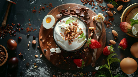 A rustic flat-lay of a yogurt bowl topped with fresh fruit, nuts, and mint leaves, surrounded by ingredients, creating a vibrant and healthy breakfast setup.
