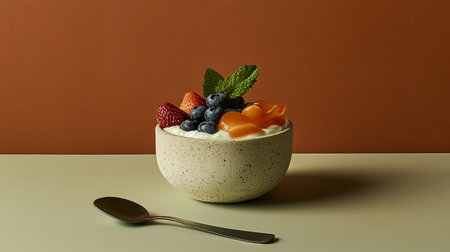 A vibrant yogurt parfait featuring layers of creamy yogurt, crunchy granola, and fresh berries, perfect for a healthy snack or breakfast option.