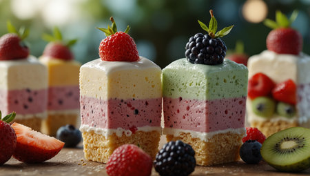 Delicate squares of sponge cake are arranged with vibrant gelee, fresh blueberries, grapes, and decorative elements, creating a visually stunning dessert centerpiece.