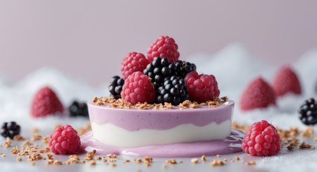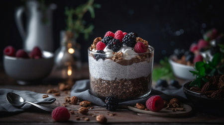 AI Generated. Delicious raspberry and blackberry dessert with yogurt and granola