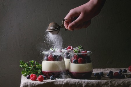 Homemade classic dessert Panna cotta with raspberry and blueberry berries and jelly in jars, decorated by mint with sprinkling sugar powder over linen table cloth with grey wall at background.