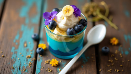 A stunning dessert cup showcases vibrant blue layers topped with creamy whipped cream, fresh banana slices, and blueberries, adorned with delicate edible flowers. This visually appealing treat is perfect for those seeking a delightful and refreshing indulgence, combining flavors and aesthetics in a charming presentation.