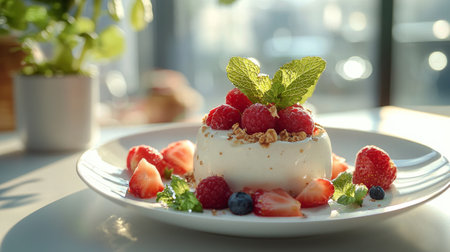 Elegant plated dessert topped with raspberries, strawberries, blueberries, mint leaves, and granola, set in natural light for a fresh and vibrant presentation.