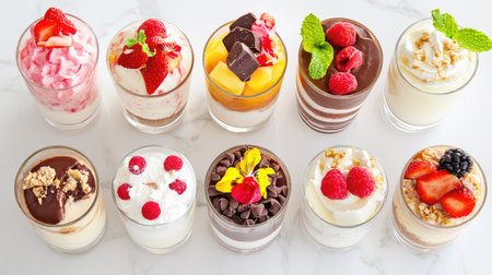 Overhead view of glass desserts arranged for Chocolate Parfait Day, showcasing rich layers and elegant presentation