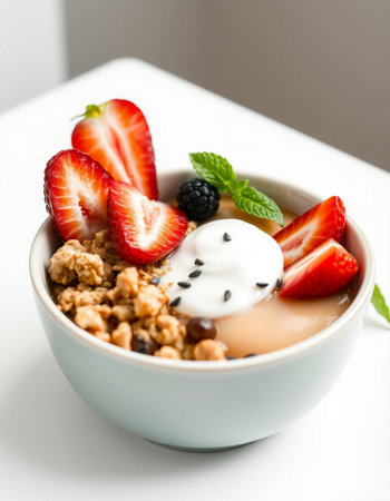 bowl of muesli with yogurt and fresh berries, healthy breakfast
