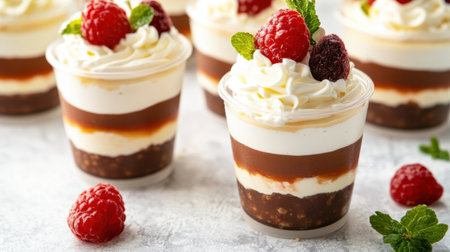 This image showcases delightful dessert cups filled with creamy goodness, topped with whipped cream and fresh raspberries, offering a perfect treat for any sweet occasion.