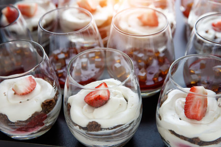A lot of glasses with strawberry dessert