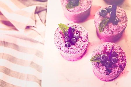 Homemade blueberry ice made in plastic cups.