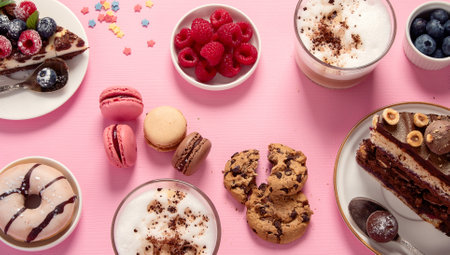 Table with various cookies, donuts, cakes, cheesecakes and coffee cups on pink background. Delicious dessert table. top view, flat lay
