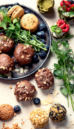 Different desserts on plates. Small cakes and berries. Creme caramel and cheesecake. Feast for sweet tooth.