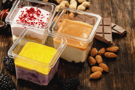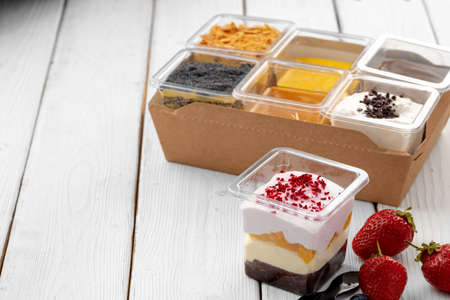 Assortment of delicious dessert boxes on wooden table