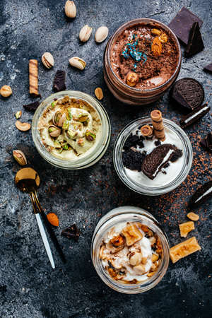 assorted ice cream served in a glass jar, italian dessert gelato pistachio, chocolate, caramel, oreo cookies, vertical image. top view.