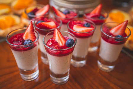 Delicious chocolate and berry desserts in shot glasses on buffet table. Catering concept
