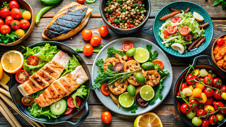 A vibrant assortment of healthy, colorful dishes featuring fresh vegetables, grilled fish, salads, and legumes on a wooden table.