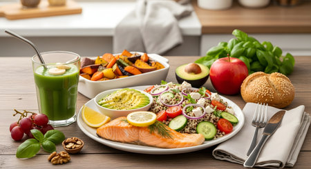 A vibrant and healthy meal featuring a salmon fillet, fresh salad, roasted vegetables, avocado, and a glass of green juice.
