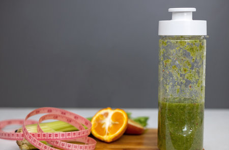 woman do healthy smoothie at kitchen, weight loss concept, measure tape