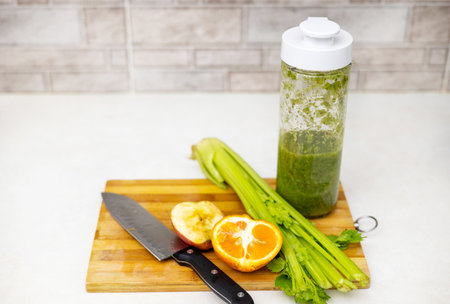 Homemade healthy green vegetable juice with ingredients on wooden table.