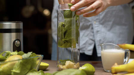 Close up female hands putting spinach leaves in a blender glass with banana slices. Healthy lifestyle and eating concept