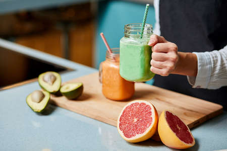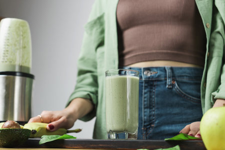 Unrecognizable woman in casual wear with glass of fresh blended healthy green vegan smoothie. banana, spinach, apple and avocado on a table.