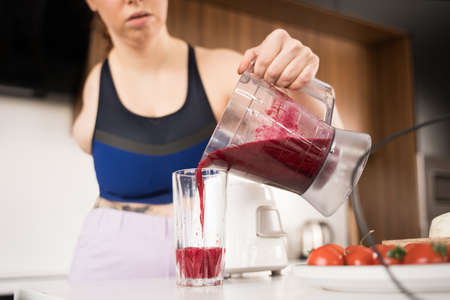 Sportive woman without hand pouring smoothie at the glass while preparing her breakfast