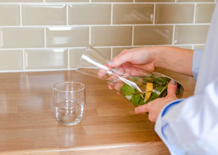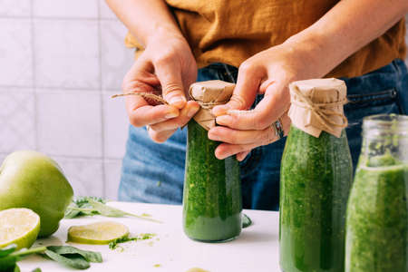 A woman pours a freshly prepared smoothie from green vegetables and fruits into glass. Vegetarianism