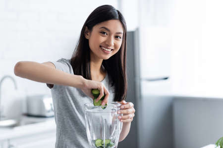young asian woman smiling at camera while adding sliced cucumber into blender