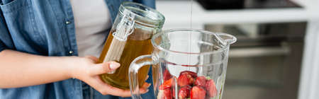 Cropped view of plus size woman pouring honey in blender with strawberries, banner