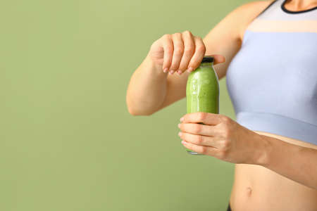 Overweight woman with vegetable fresh vegan detox smoothie. Clean eating, weight loss, healthy dieting food