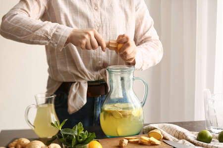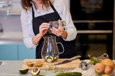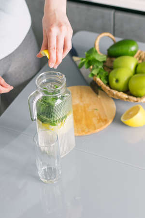 Woman in sportswear makes detox drink with lemon mint in kitchen at home. Rejuvenating invigorating water lemon,