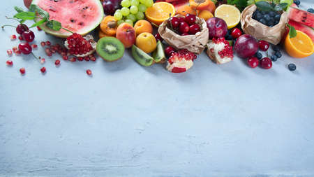 Flatlay assorted fresh and ripe fruits and berries. The concept of healthy eating.
