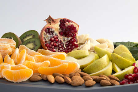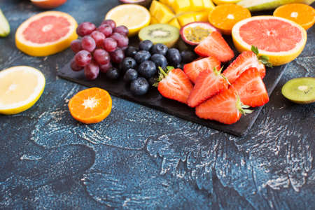 Close up of raw fruits platter, oranges, lemons, kiwis, grapefruits, strawberries, grapes, blueberries, pears, passion fruit, mango on the black slate on the dark blue background