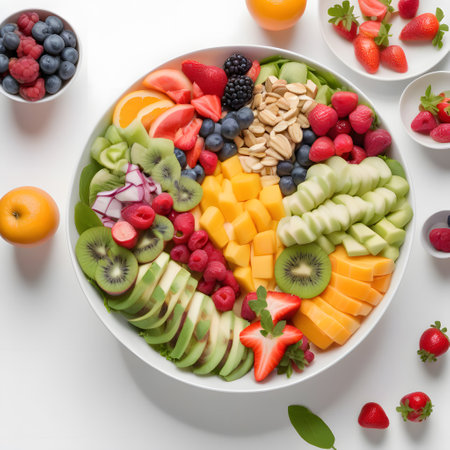 deconstructed fruit salad with ingredients in rows, created with generative ai