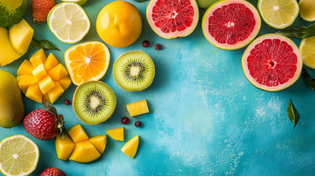 A vibrant arrangement of fresh citrus fruits and berries on a blue background, highlighting their freshness and color, suitable for healthy eating and vibrant nutrition themes.