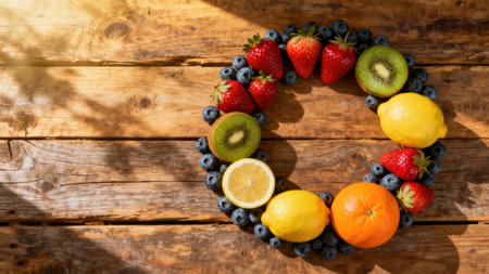 Overhead view of blue, red, yellow, and green fruits including strawberries, lemons, and kiwi slices arranged in a circular frame on distressed brown wooden planks with strong sunlight and shadows.