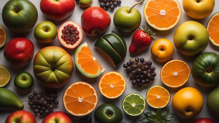Overhead shot of a selection of fresh fruits, arranged in a flat lay style, with a focus on the vibrant colors and textures of each fruit