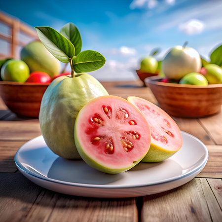 A mouthwatering 3D illustration of a ripe guava. perfectly sliced and ready to be enjoyed. The image features a vibrant. juicy interior. highlighting the fruit's refreshing appeal. This image is perfect for adding a touch of summery freshness to your projects.