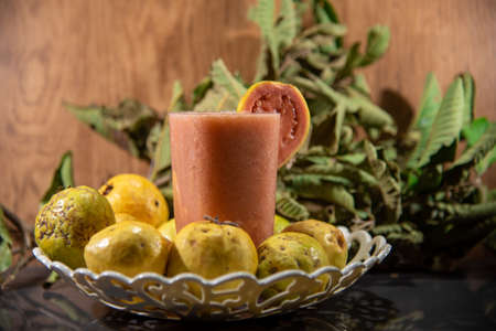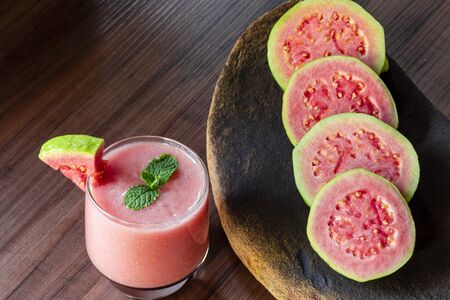 Delicious red guava juice alongside a slice of guava, in the background guavas and leaves on rustic wood.