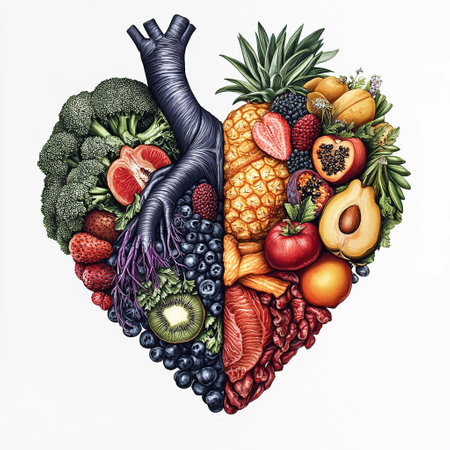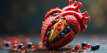 A human heart, anatomically accurate, but constructed entirely of a vibrant assortment of organic fruits, vegetables, nuts, and seeds.
