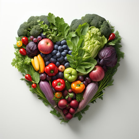 Creative composition of assorted fresh fruits and vegetables arranged in the shape of a heart on a white background. The vibrant mix includes strawberries, bell peppers, tomatoes, broccoli, and leafy greens, symbolizing healthy eating, love for nature, wellness, and nutrition. Ideal for concepts related to vegan lifestyle, plant-based diets, and health awareness campaigns.