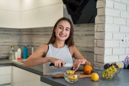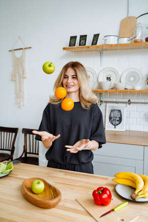 A wonderful girl juggles fruit in a bright kitchen. Charming smile and happy eyes. Joy is in the little things. prepare healthy snacks.incredible female beauty. high quality photo
