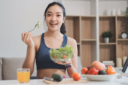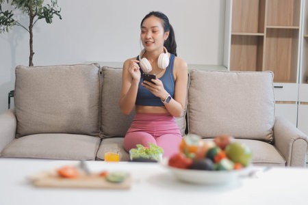 Fit young Asian women in activewear sitting on yoga mat and eating fresh vegetable salad after workout, representing clean eating, fitness lifestyle, wellness routine and health balance.