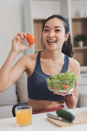 Asian attractive active woman holding bowl of fruit in kitchen at home. Portrait of active sport girl in sportswear enjoy eat apple healthy food for health after exercise and look at camera in house.